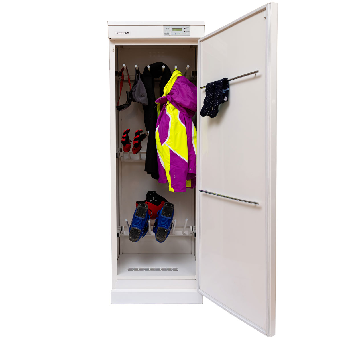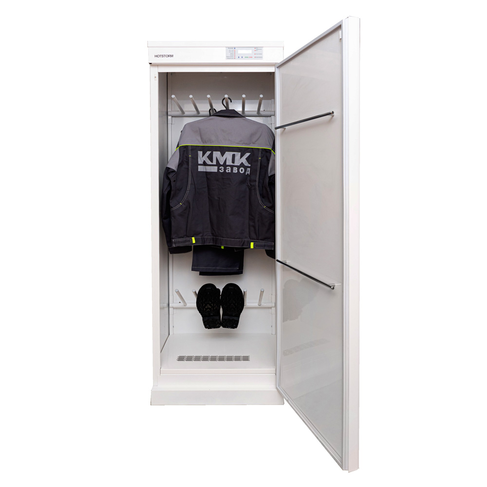 - Внутри корпуса установлены три регулируемые полки, которые могут поворачиваться и фиксироваться в вертикальном положении. На полки можно укладывать для сушки рукавицы, головные уборы или обувь. К полкам можно так же подвешивать плечики с одеждой. Шкаф закрывается одной дверью, которая имеет магнитный уплотнитель по периметру, ручку для открывания и на замок не закрывается.