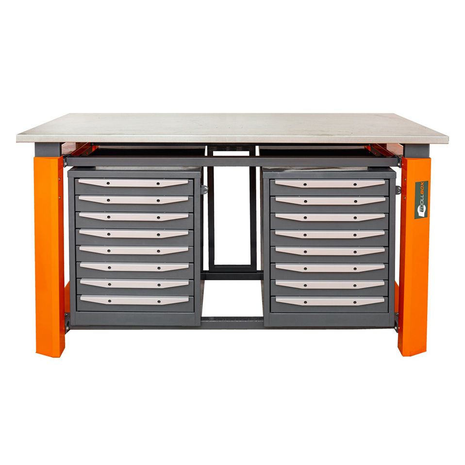 Верстак ТВР1800(ТВ8-ТВ8) — это основательное рабочее место для мастерской, сервисной зоны или производственного участка, где важны не только прочность и удобство, но и продуманная организация хранения. Модель рассчитана на интенсивную ежедневную эксплуатацию: широкая рабочая поверхность подходит для слесарных, сборочных и ремонтных операций, а две тумбы с выдвижными ящиками помогают держать инструмент, крепеж и расходные материалы всегда под рукой.